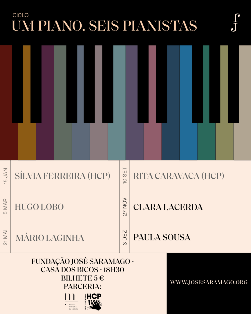 A Fundação José Saramago, em parceria com o Hot Clube de Portugal e o Museu Nacional da Música, apresenta em 2025 o ciclo de concertos «Um piano, seis pianistas», que trará alguns dos melhores intérpretes deste instrumento musical na área do jazz ao seu auditório, na Casa dos Bicos.