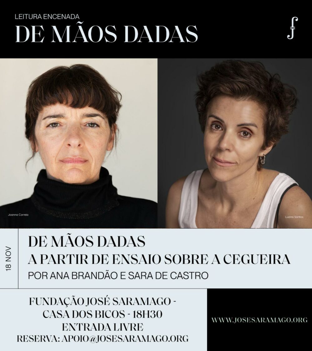 No dia 18 de novembro, às 18h30, para celebrar os 30 anos da publicação de «Ensaio sobre a Cegueira» e o 103º aniversário de nascimento de José Saramago, as atrizes Ana Brandão e Sara de Castro apresentam, no auditório da FJS, a leitura «De mãos dadas», a partir de «Ensaio sobre a Cegueira». Após a leitura haverá uma conversa com as atrizes sobre a participação de ambas em adaptações teatrais do referido romance.