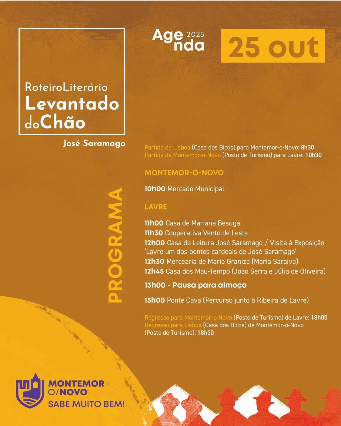 No dia 25 de outubro será realizado o percurso nº 3 do Roteiro Literário Levantado do Chão intitulado “José Saramago em Monte Lavre”. Trata-se de uma iniciativa da Câmara Municipal de Montemor-o-Novo com apoio da FJS.